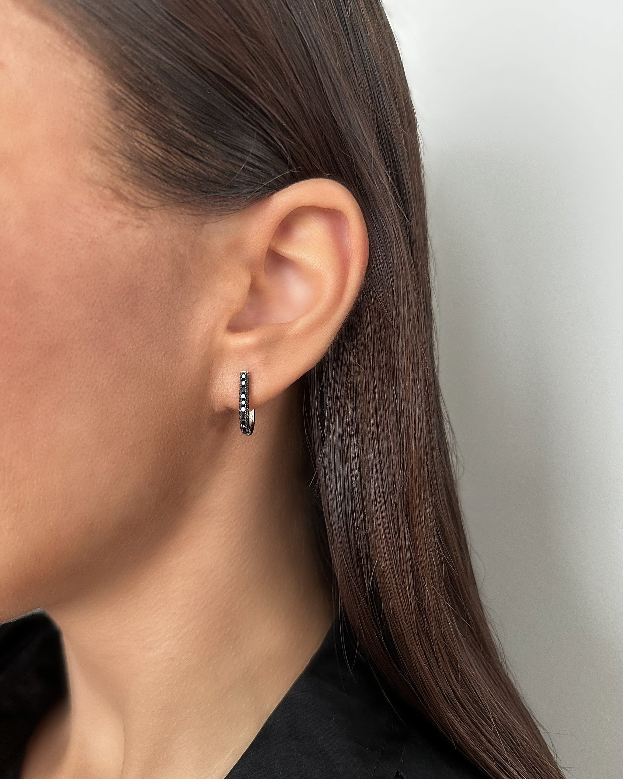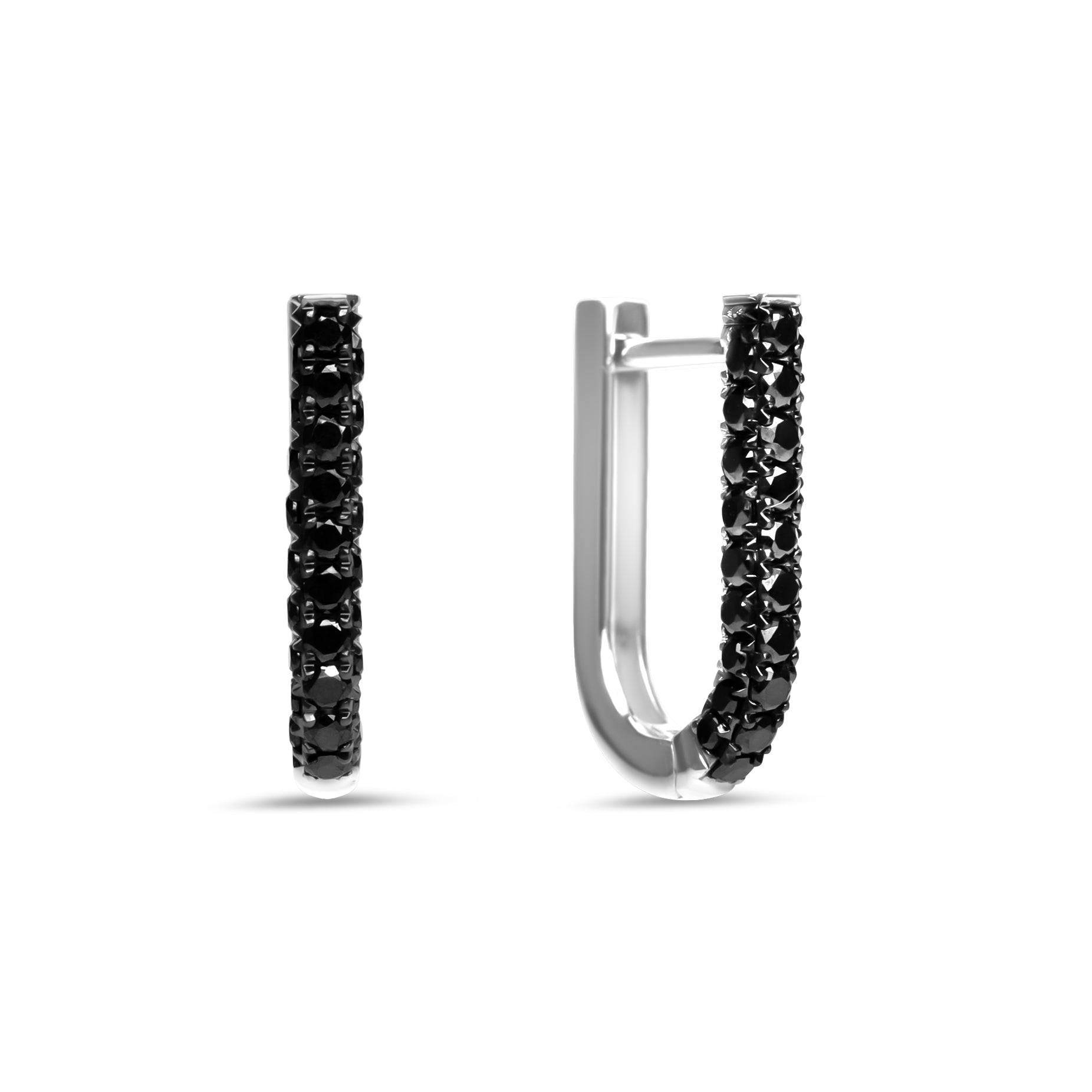 Here's a modern take on classic hoop earrings in a unique U-shape design. These earrings are expertly crafted with a combination of white gold and black diamonds to create a flawless and luxurious accent for any outfit. The black diamonds are set on three sides of the earring, adding a distinctive solidity that demands exceptional artistry.