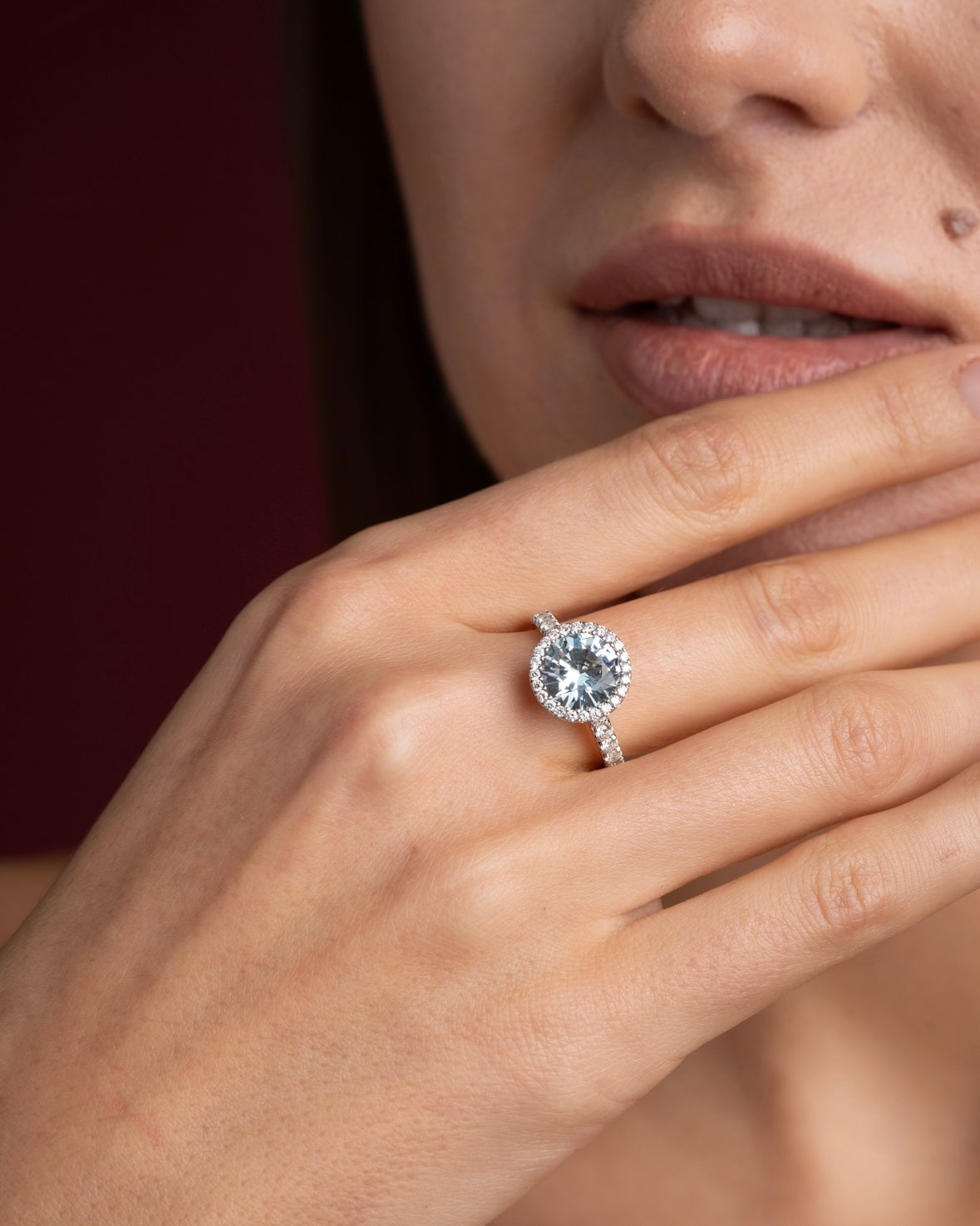 Žiedas su idealiai šlifuotu 3,42 ct sky blue spalvos topazu, apjuostas plona deimantų eilute.