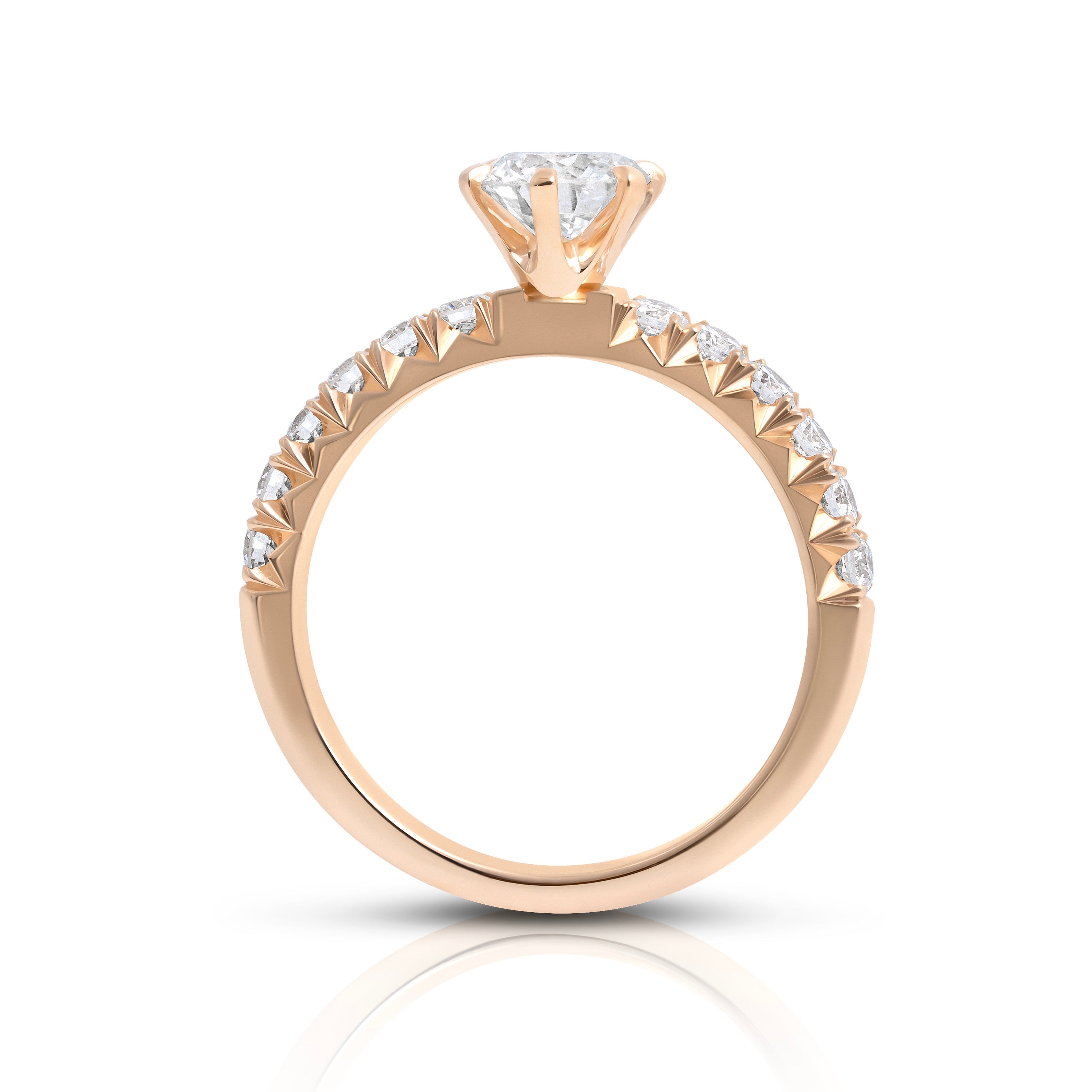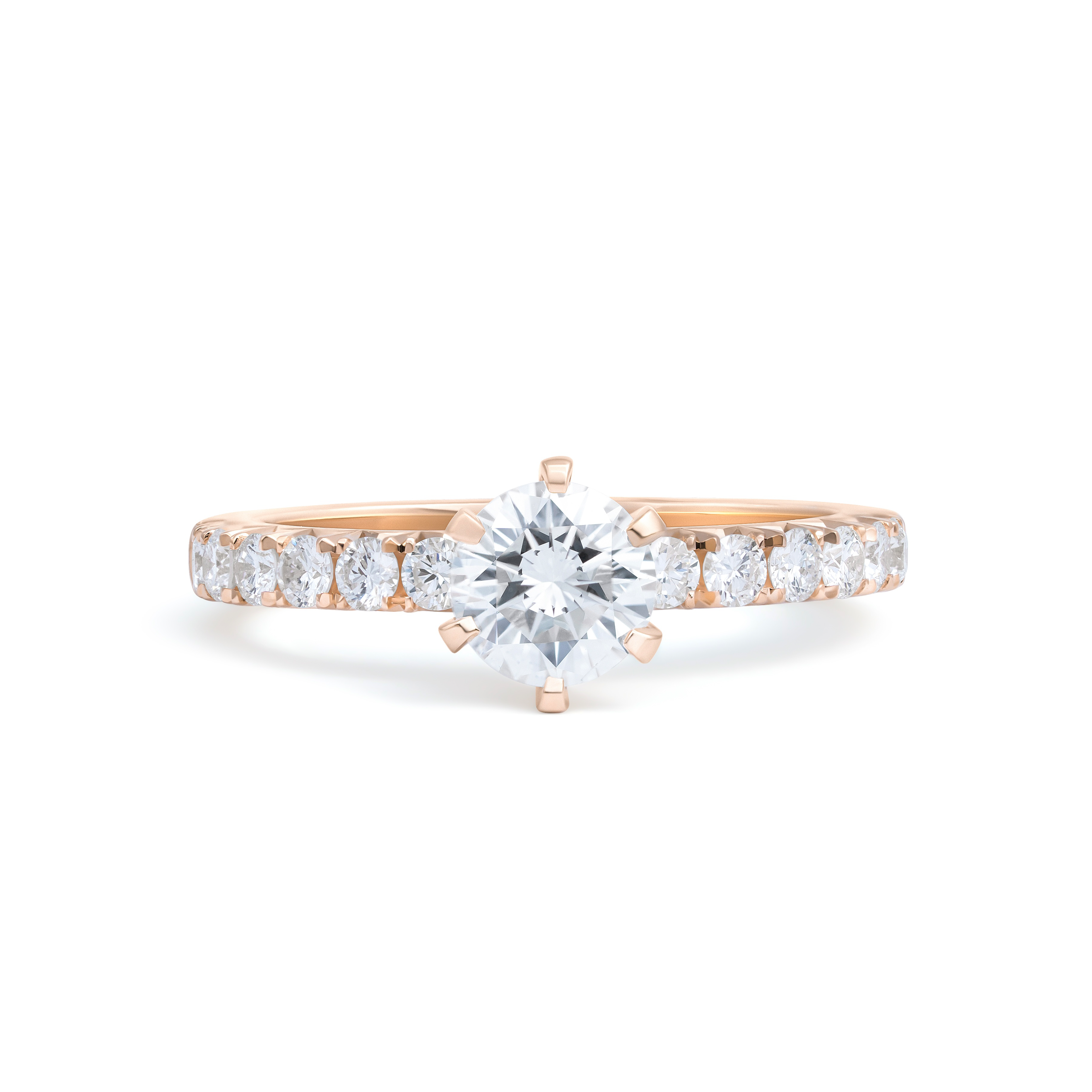 Išskirtinai prabangus sužadėtuvių žiedas, kurio kiekviena detalė kuria unikalumą. Centre - žėrintis 0,5 ct briliantas iš šonų apsuptas 12 vienetų jo spindesį pabrėžiančių smulkių deimantų. Paaukštintas žiedo profilis leis šalia idealiai priglusti vestuviniui žiedui, o French - pave šoninis žiedo reljefas suteiks papildomo žėresio, kai į žiedą žvelgsime iš šono.