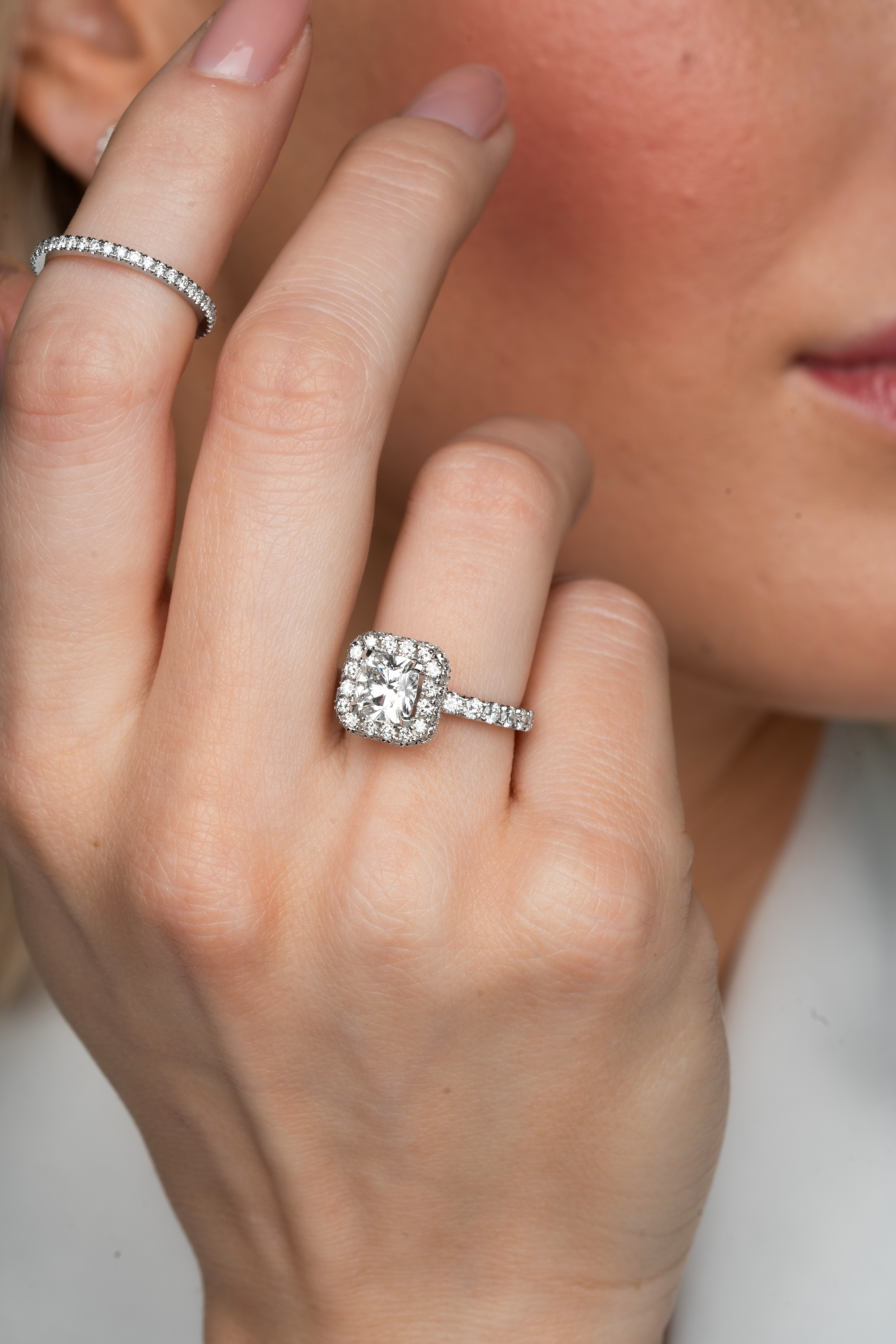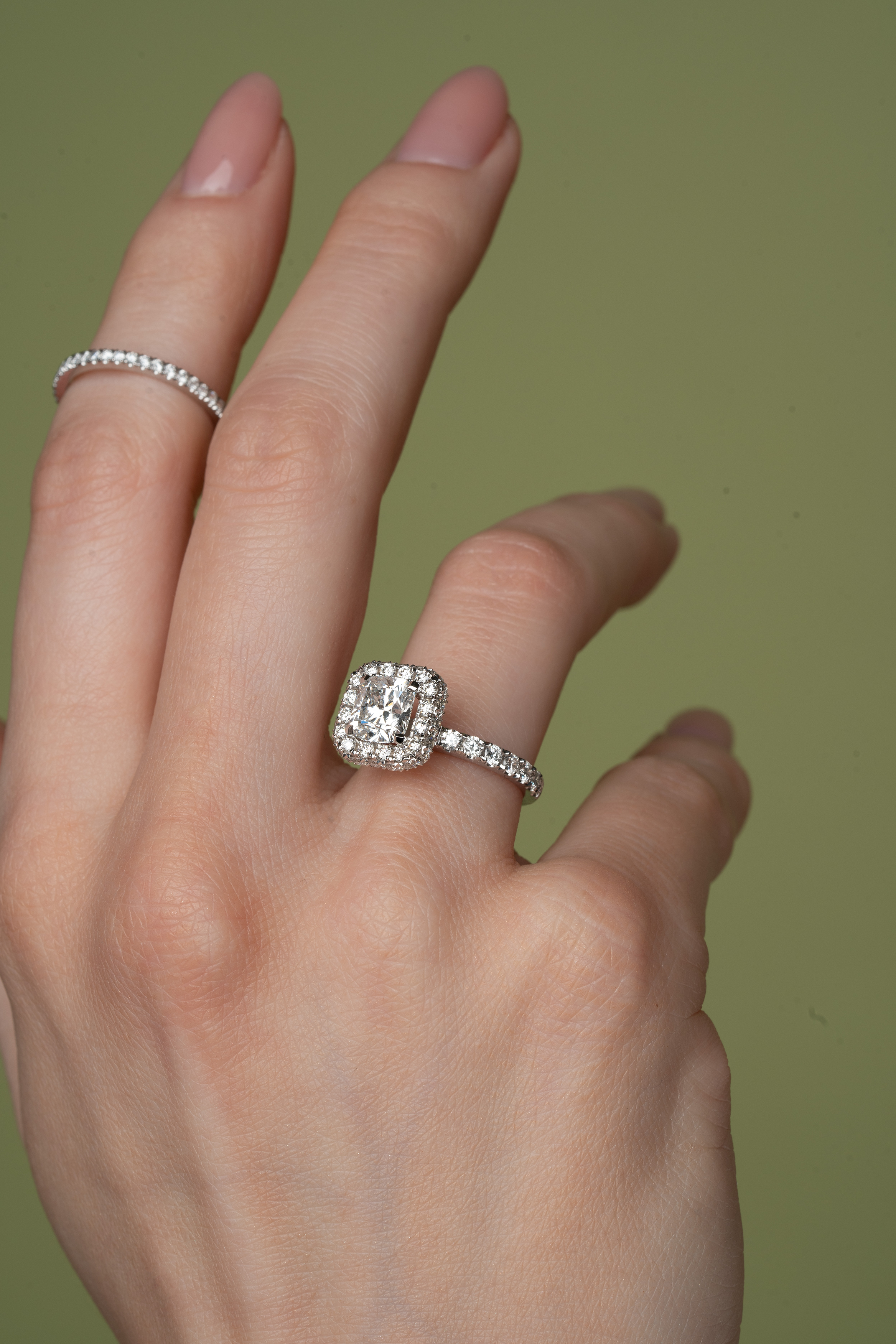 Modernaus dizaino, aukšto profilio bei kvadratinių formų halo stiliaus žiedas, kurio centre žėri 1,5 ct deimantas.